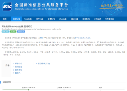 《再生資源分揀中心建設和管理規(guī)范》(GB/T45083-2024)由中國再生資源回收利用協(xié)會牽頭起草,已于11月28日由國家市場監(jiān)督管理總局、國家標準化管理委員會2024年第29號公告發(fā)布,將于2025年6月1日起實施。 國